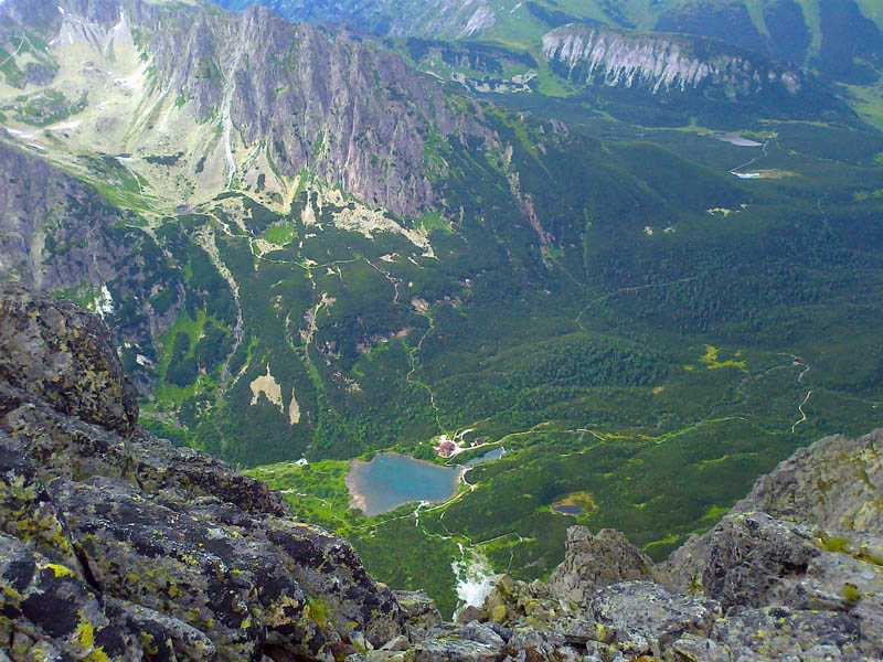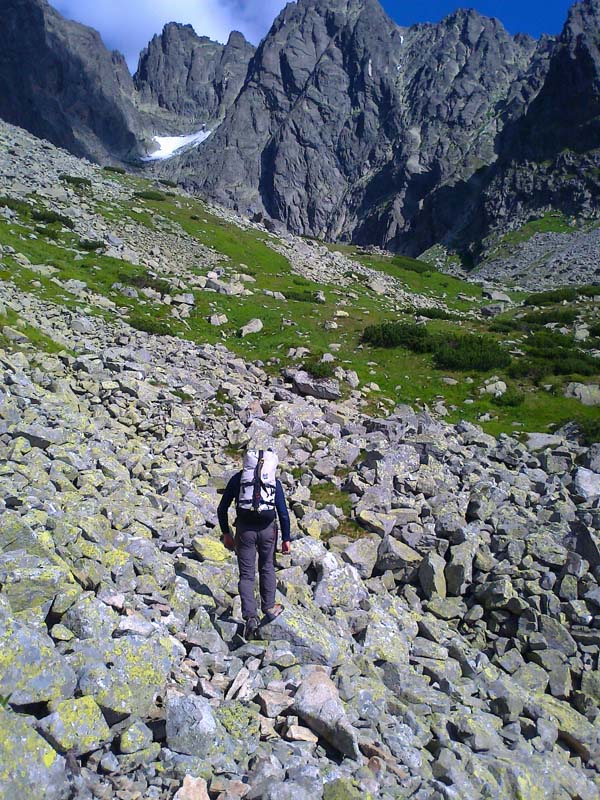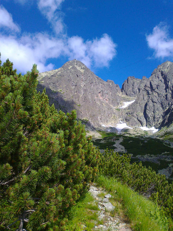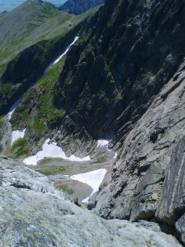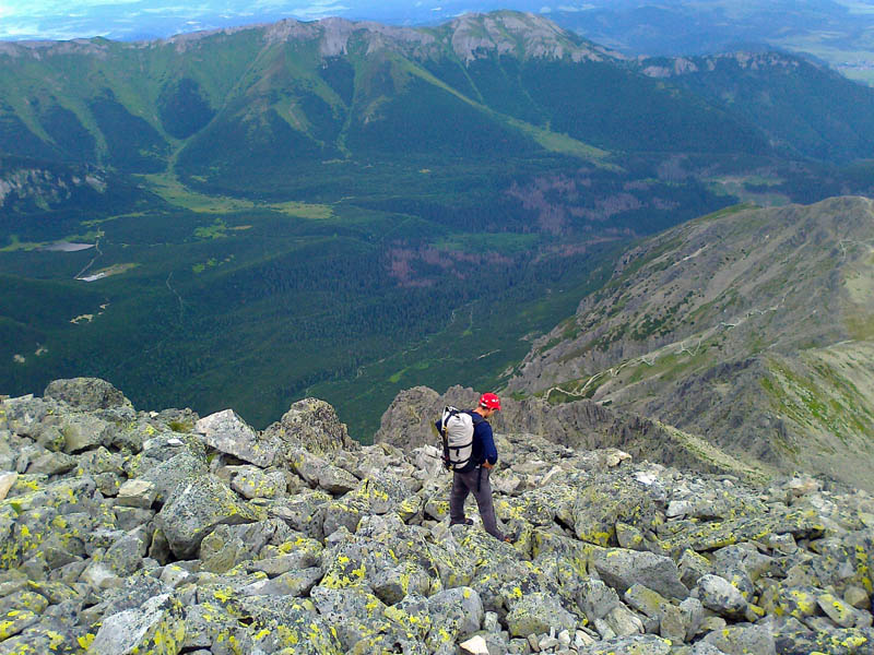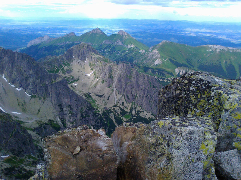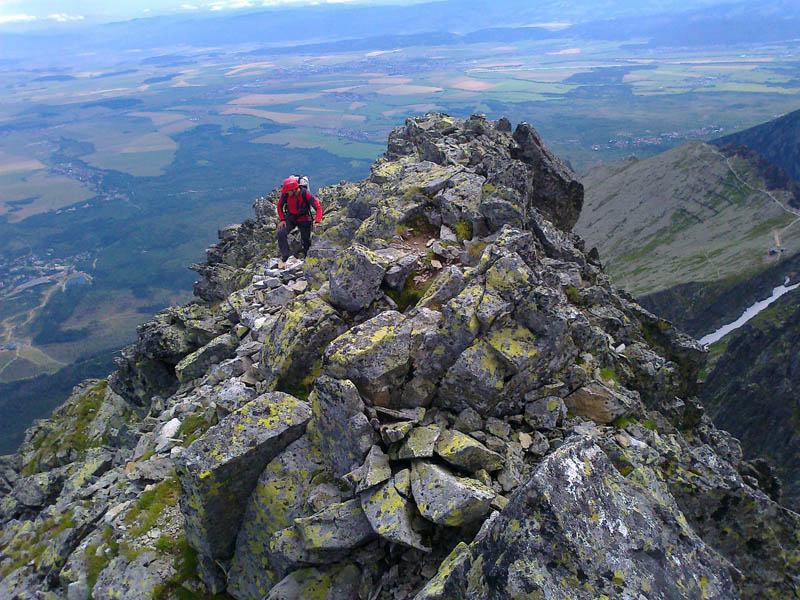 Problémové miesta som nepostrehla - ide o pekné, ľahké lezenie, aj keď sme mali cestu miestami zatečenú. Celý čas krásne výhľady na Lomničák a Skalnaté pleso. Lezecký čas (ak nerátam nástup pod stenu) predstavoval približne 4 hoďky, čo bolo podľa môjho spolulezca a šéfa expedície veľmi biedne, ba až zlé :-))) Ale ja som si cestu užívala a keď je niečo dobré a krásne, tak je predsa fajn, keď to trvá čo najdlhšie :-)) Na vrchol sa ide už pešo po kameňoch. Zo štítu perfektne vidieť východnú časť Vysokých Tatier, Belianky, Lomnický štít a Vidlový hrebeň, ktorý je akousi jeho spojnicou s Kežmarákom. Naša zostupovka smeruje do Huncovského sedla, dole Svišťovkou na Brnčalku. Pekný deň za nami. Predpovedaný dážď nás stíha až tesne pred chatou.