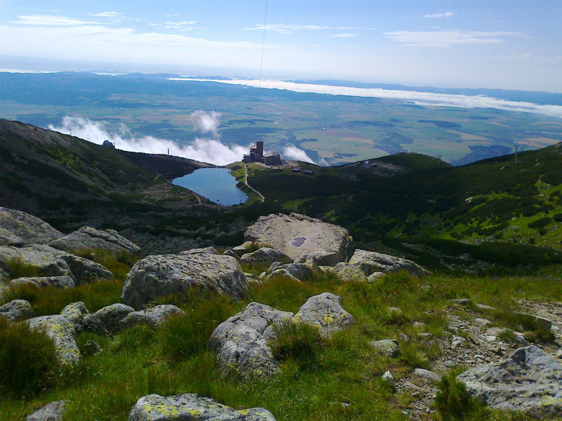 Všetky verzie náhradného programu v prípade hnusného počasia definitívne padli vo Svite, kde sa pomedzi hustú hmlu začínalo predierať slnko a modrá obloha. Pôvodný plán vyšliapať pekne pešo po svojich na Skalnaté pleso a odtiaľ na nástup pod stenu zlyhal, keď nám ráno nešiel vlak, a tak sme použili „klasickú“ turistickú alternatívu a nechali sme sa „nešportovo“ vyviezť prvou lanovkou z Lomnice spolu s davmi ceprov, dúfajúc, že to nezníži hodnotu nášho „výkonu“.