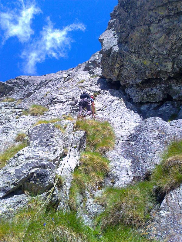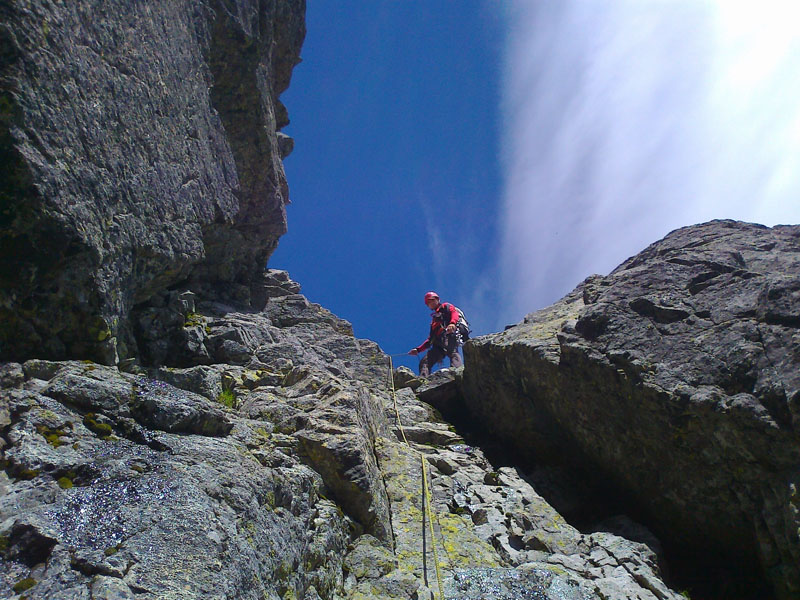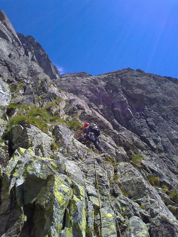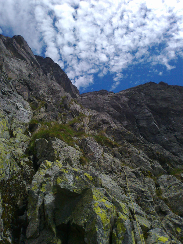 Slnko pečie. V Skalnatej dolinke si chladia bruchá na fľakoch snehu zvedavo pozerajúce kamzíčie rodinky. A sme na mieste. Ja v klasickej úlohe hlavného ističa, doliezača a fotografa. Naväzujeme sa na lano a vyrážame, zároveň s lanovkou na Lomničák, ktorá nám v ten deň prefrčí ponad hlavy asi 1000 krát. Celá trasa ľavým vhĺbením je peknou logickou líniou, ktorá ako zisťujeme je nanovo preistená - nielen štandy, ale aj nity na postupové istenia, takže niet kde zablúdiť.