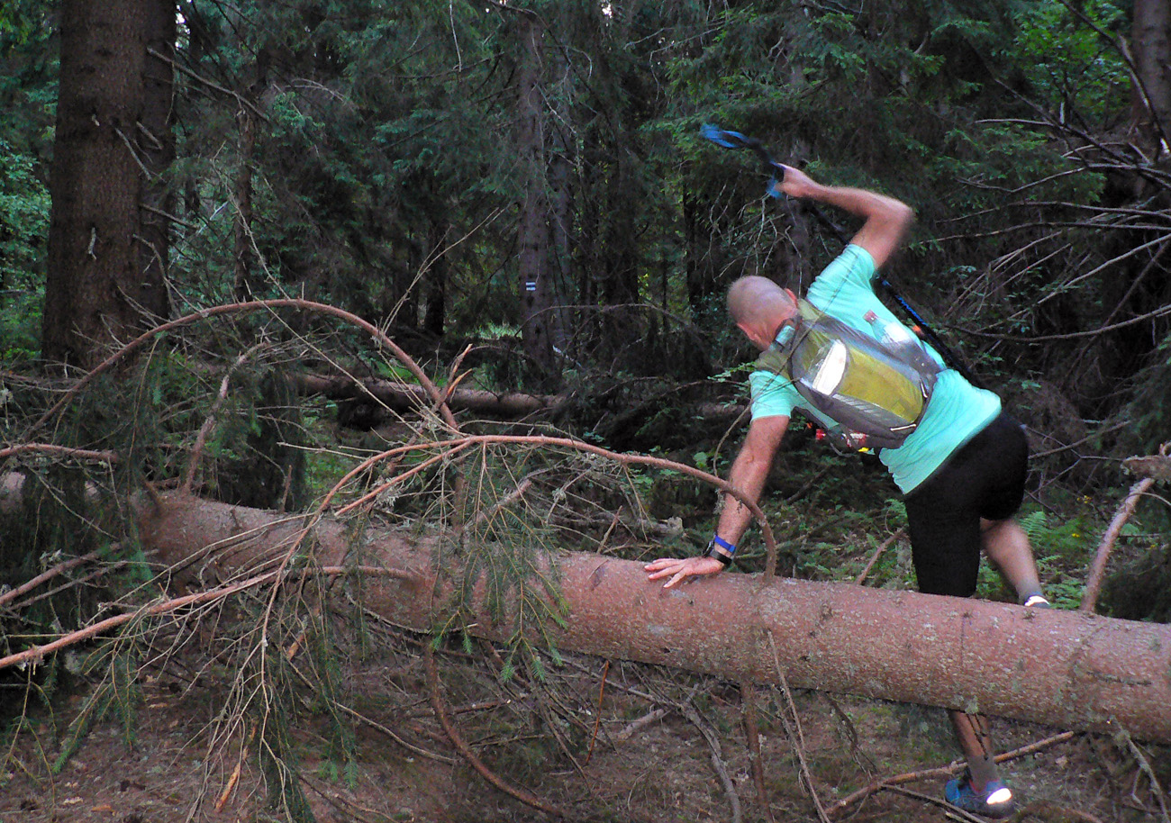Poslušne sme si zopakovali prvý úsek z prvého ročníka MF100 ( 2013 ): po hrebeni Kysuckej vrchoviny do Zázrivej. Kombinácia pekných lúk a hnusných zvážnic, tentokrát našťastie za sucha. Novinkou boli len následky ostatnej zimy – pováľané stromy. Fasa preliezačky na rozhýbanie. Nasledovala ale odmena v podobe výhľadov na Fatru a skoro všetky jej strmáky, keď sme sa pod Javorinkou vynorili z lesa a zbiehali do Zázrivej.