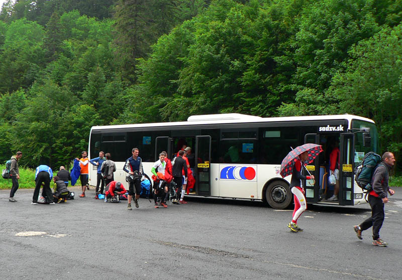 Tradične natrieskaný autobus sa štverá na Trangošku, vonku síce neleje, ale prší pekne, nikto sa akosi nehrnie von. Prístrešok pri štarte je o chvíľu plný, ostatní zháňajú suchý pľac pod stromami. Pohľad hore do rýchlo sa sunúcich mrakov navodzuje „trošku nervozity“. Tú ale rýchlo zažehnáva riaditeľ pretekov pokynmi o správaní sa pri stretnutí s medveďom – je ich tam vraj v lese nad Donovalmi požehnane :-)