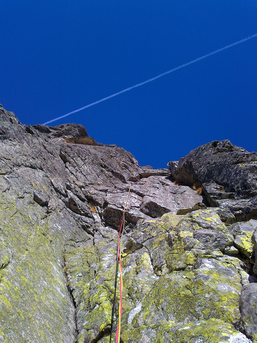 Začína kľúčová tretia dĺžka. Matúš zhora kričí, že sa mu to nezdá také ľahké, aké mal informácie :) Nakoniec sa mi po krásnych platniach darí doliezť k chalanom na štand bez väčších problémov. Kľúčový previštek sa dá obliezť morálovým traverzom sprava. Nebolo treba silu v rukách, ktorú nemám. O to dôležitejšia bola práca nôh.