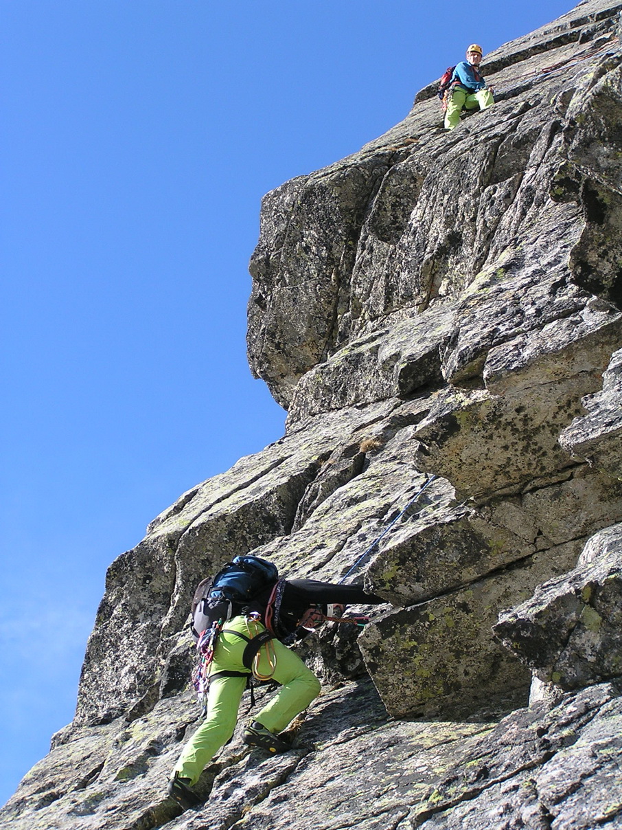 Tu sa naväzujeme. Pôjdeme dve dvojky za sebou. Následuje dĺžka pekným komínikom, po asi 40 metroch štandujeme na plošine vpravo. Tu už začína (aspoň pre nás) vážnejšie lezenie. Podľa sprievodcu je to za V. Zakladáme niekoľko vlastných istení do veľmi peknej, kompaktnej tatranskej žuly. Tretia dĺžka končí štandom na platni. Sú tam skoby,.