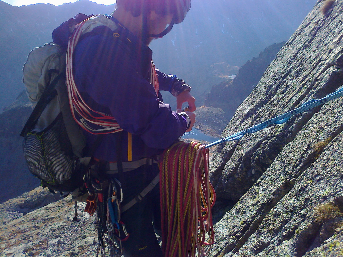 Matúš šiel viac vľavo a v tomto momente už lezie pilierom piatu dĺžku. Ani jeden z nás si nie je istý, kadiaľ presne to malo ísť, ale na pilieri už je smer jasný. Chalani nám utekajú, na pilieri je miesto kde musí aj druholezec kúsok zliezať exponovanú hranu.