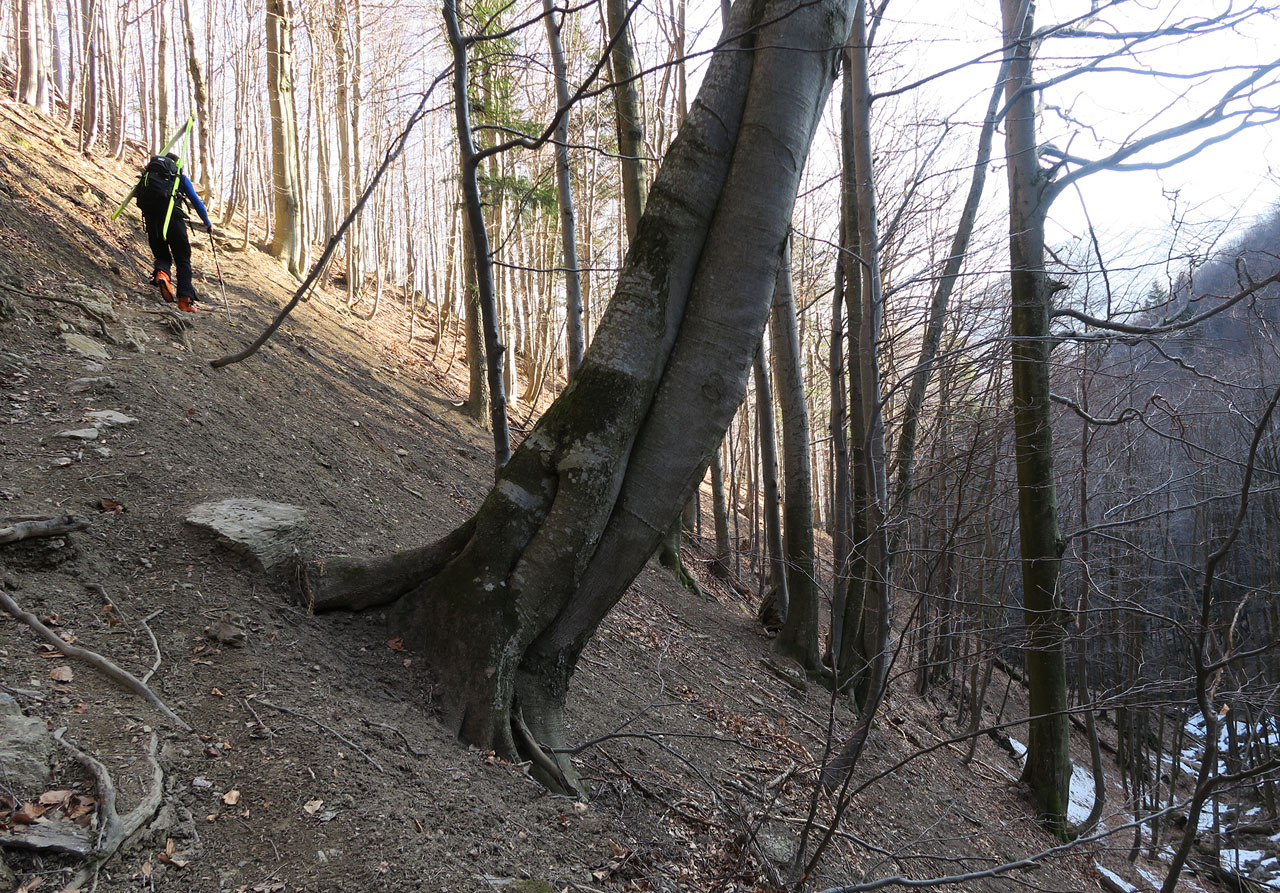 Stretávka na spodnom parkovisku v dohodnutom čase.Prvá prekážka je celkom výdatný potok,lebo lávky niet,a už si to smerujeme niekde do miest sedlo Kraviarske.Ideme napešo najprv po suchej cestičke,neskôr po kameňoch,medzi ktorými je ľad a na ňom lístie.Nie je to celkom pohoda,vyšie v bukovom traverze už fajne a sucho.