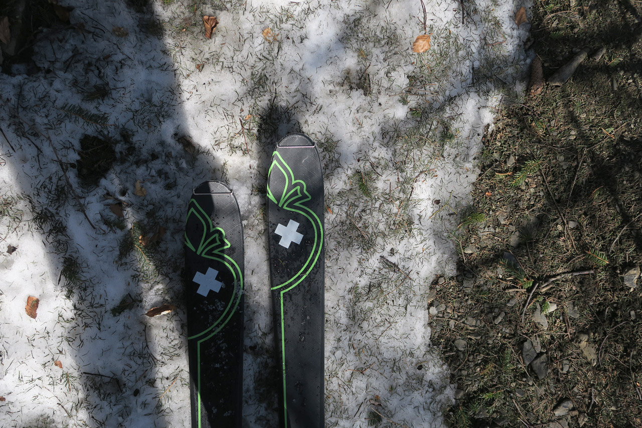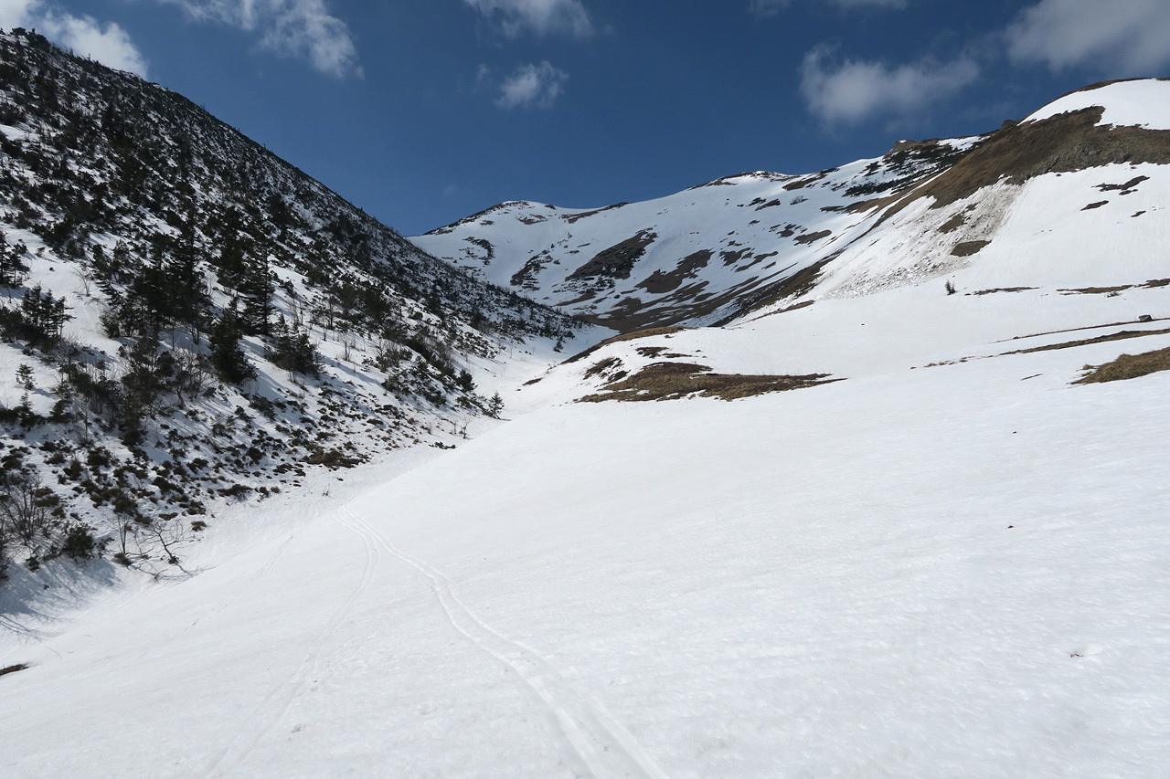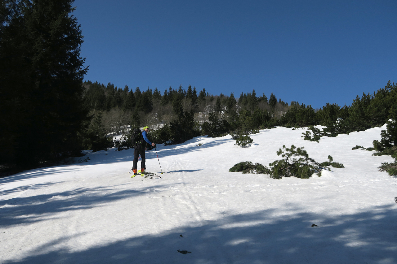 Asi 50 výškových od hrebienka sedla Kraviarske zapíname do lyží,ťaháme sa kus vľavo od smerovníka a takto pohodlne,síce s haršajzňami,lebo severy,si cupkáme v miernom ale celkom štipľavom vetríku na hlavný hrebeň do sedla Bublen a myslíme si,že takto budeme pokračovať až na Malý Kriváň.Na hrebeni prekvapenie,snehu niet a treba nosiť.Aj po trávičke aj po blate a skale.Pár úsekov ideme aj na pásoch,ale veľmi málo.Cestou obzeráme podmienky na nami zamýšľaných zjazdovkách,pričom prvá vedie z malého Kriváňa kúsok jeho južným chrbtom a potom zatáča v smere k svojmu väčšiemu bratovi.Druhá potom z jeho východného výbežku.Snehu je tam dostatok.Slniečko naberá na sile a miestami vyzliekame a naopak,v závislosti od toho,čo nám dovolí severný vetrík.