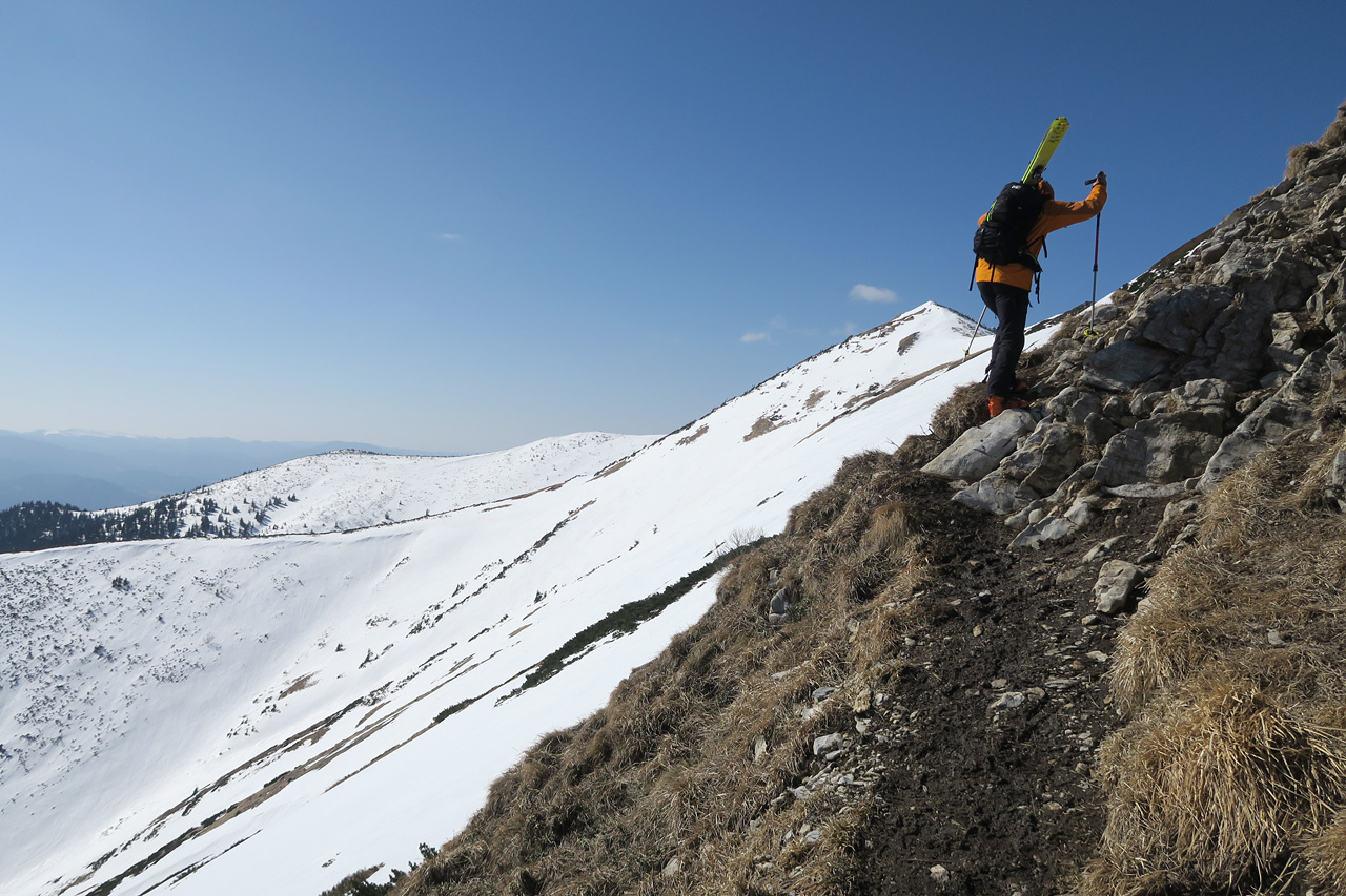 Pár metrov pod vrcholom ideme opäť napešo,sneh už tu nie je,len zo severu omrznutá tráva.Chvíľočka hore a už si to špacírjeme do miest,kde sa dá zapnúť.