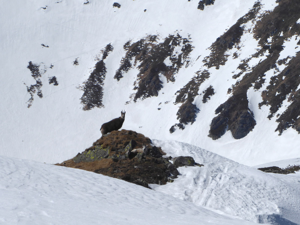 Chvíľu postávame a dávame prednosť v jazde čriede kamzíkov.Všetky okrem jedného sa ťahajú na juh,keď nás vidia.Ten jeden ešte ide kúsok hrebeňom a v mieste bez preveja skočí do severného svahu.Potom ho vidíme ako sa chladí v tieni.Huncút.Pred nami vľavo Skalka,Chabenec a vzadu komplet Krivánska MF.Onedlho sme v sedielku,ktoré bolo vystavené napriamo slniečku a tak konečne prestrojujeme do lyží.Zjazd fantastický,až po smerovník pri potoku,kde vypíname a lesíkom sa ťaháme po zjazdovku,kde na terase zavretého bufetu chvíločku vstrebávame zážitky dnešného dňa.Po prázdnej zjazdovke schladzujeme telesné schránky a lúčime sa pozdravmi vysmiatych tvárí.