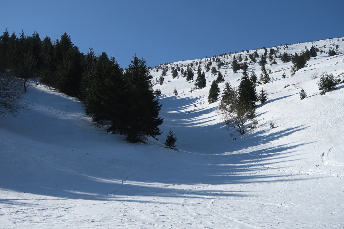 Pauzujeme na starej chate Slovanu so zbortenou strechou,kde končil kedysi oddielový „bejby“vlek.Neponáhľame sa,je neobvykle tvrdo,len uvažujeme,či potiahneme hore na Chleb,ale rozlúskne to pohľad z hrebeňa na Veľký Kriváň,kde už niekto zjazduje a nepočuť ho,takže predpokladáme,že tam už je odmäknuté.