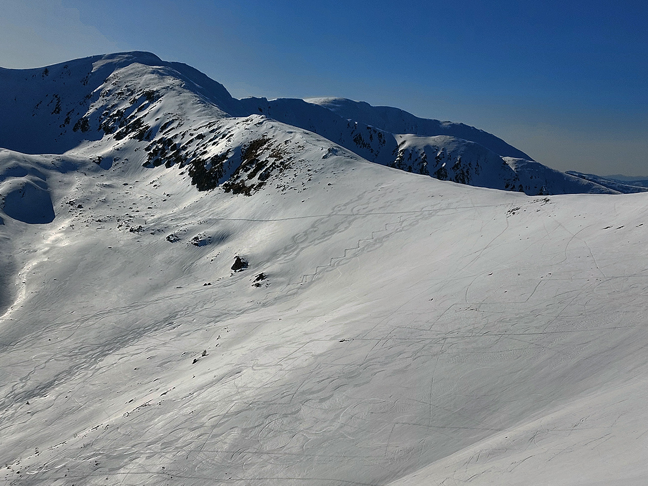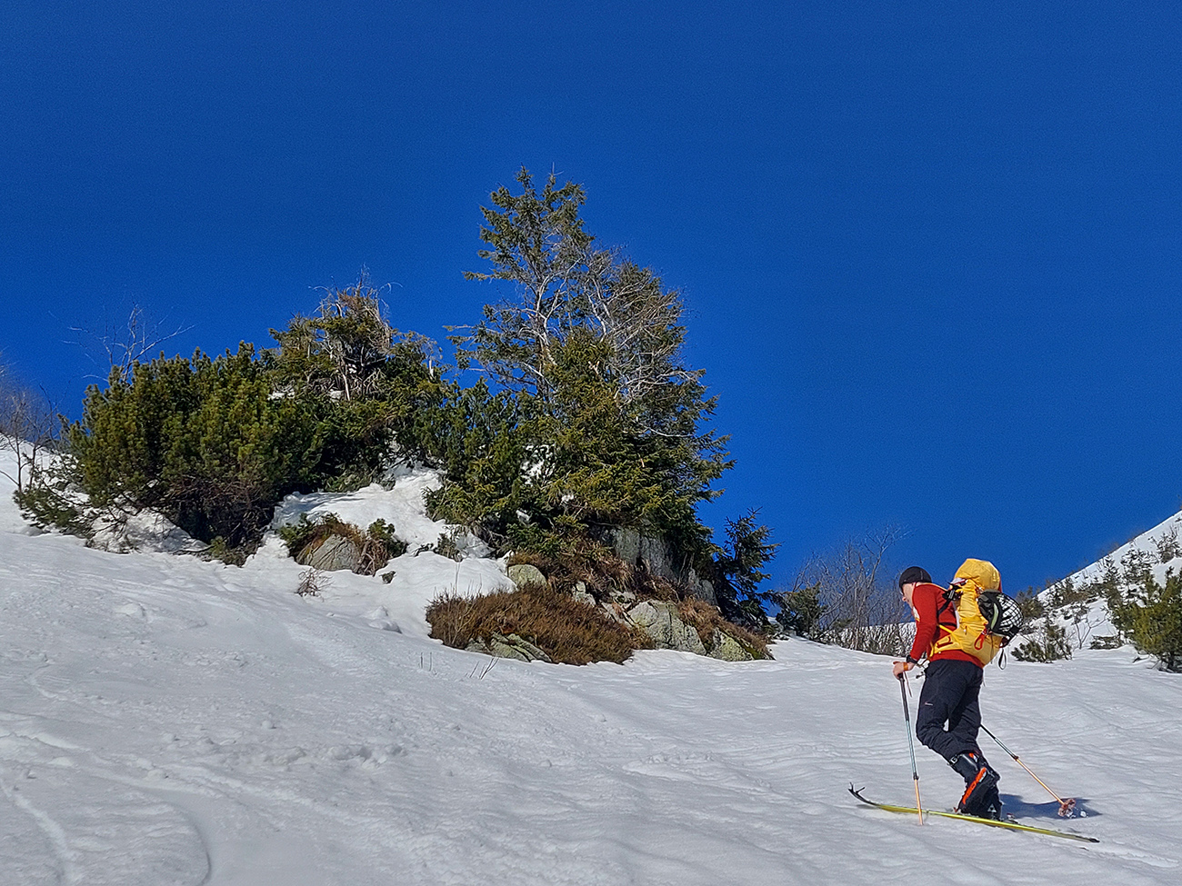 Výšľapy boli aj celkom výživné v tom teple, tak teda že mizneme do tieňov a domov. Takže sme sa prepotácali po hrebeni na Dereše a takmer z ich vrcholu sme to rubli kúsok dole po severnom rebre medzi východným a stredným kotlom – aby sme zatočili doprava, do hlbokej modrej polotmy vari hneď druhého žľabu.