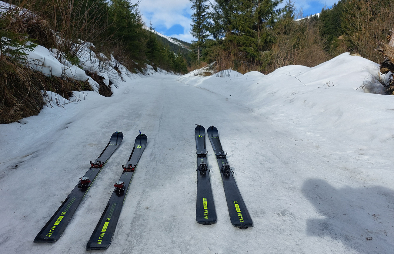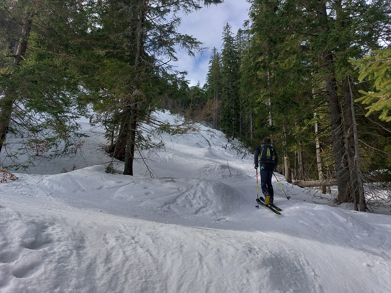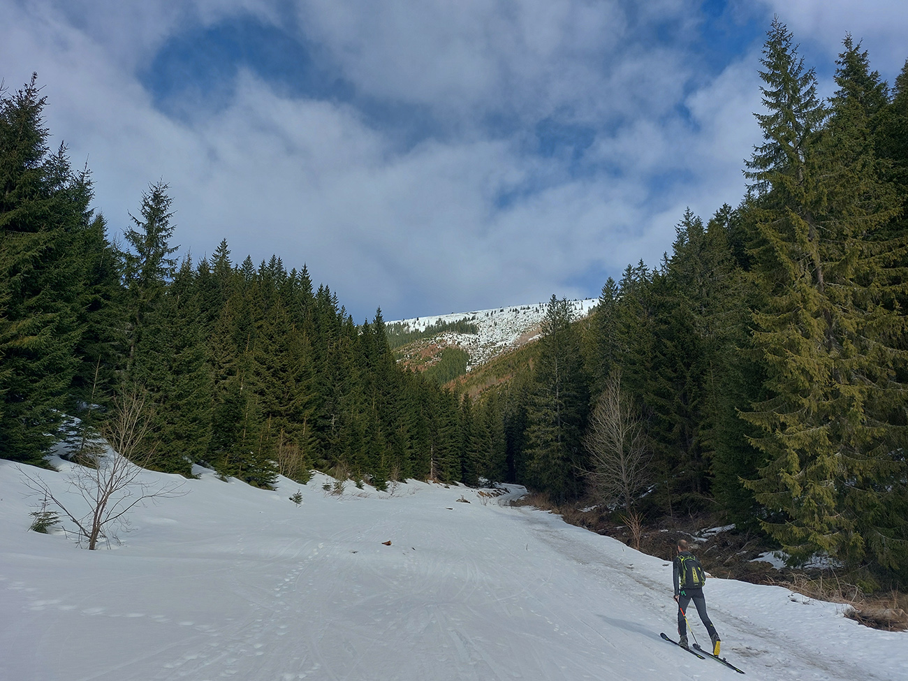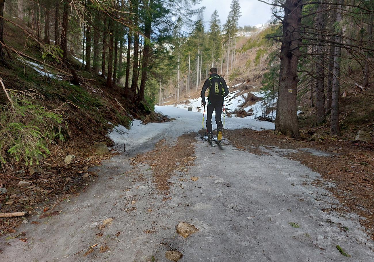 Takže dno doliny – tam sa ešte dlho bude dať. Hrubá vrstva udupaného snehoľadu, len v dolnej časti na pár miestach pod stromami bez snehu. V lesíku hojdavé, vyšmýkané mnohovariantné chodníčky, ráno trochu ľadové, popoludní smerom dole hravé.