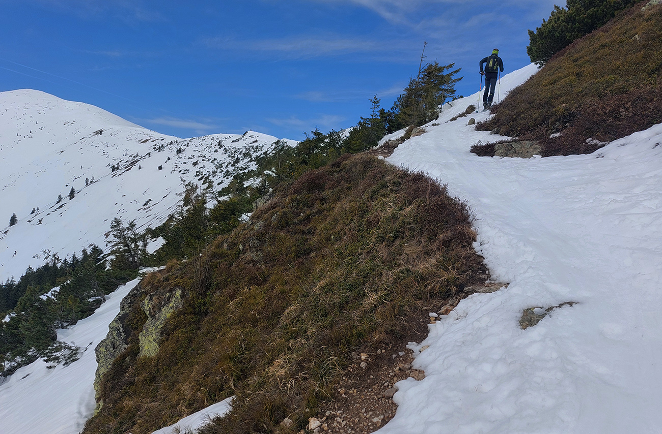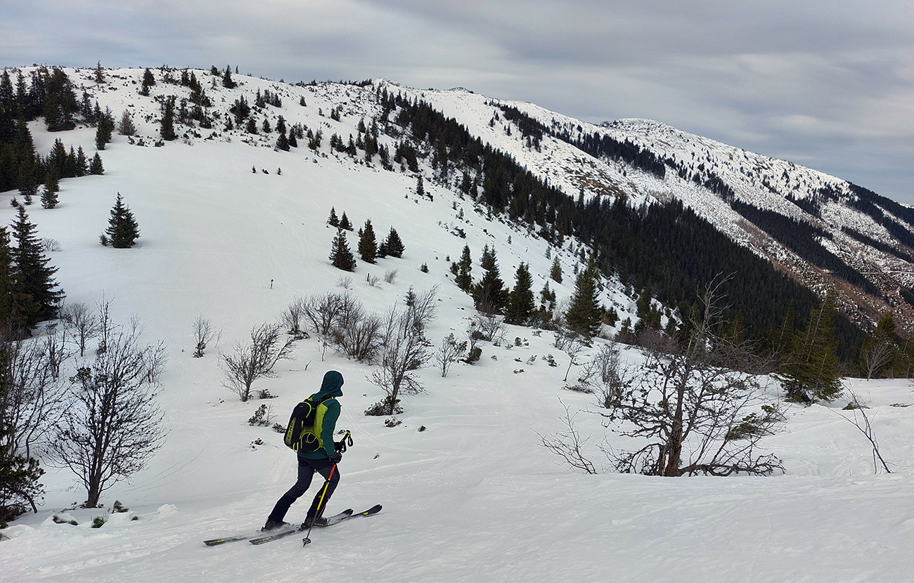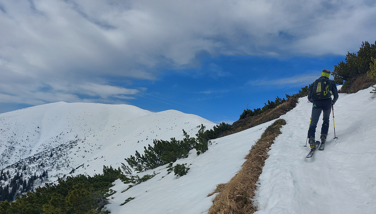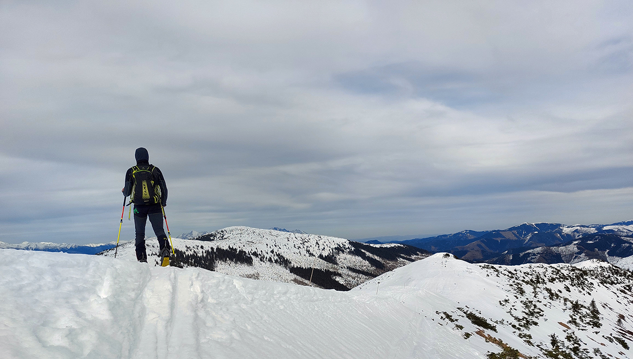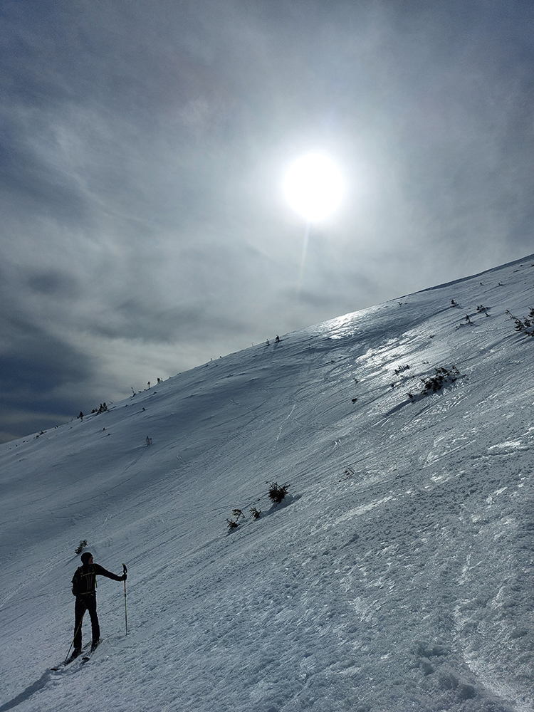 Na hrebeni voľba jasná – stúpame ďalej, na Besnú (1807 m). Lebo vraj je chuť lyžovať a zhora sa uvidí, čo by sa dalo. Lebo je pod mrakom a teda pod nulou, sobotné čisté nebo sa nekoná, pod lyžami to dosť hrkoce. Stúpame miestami už len po zvyškoch, okolo Panskej hole to už dlho v tom južnom traverze nevydrží.