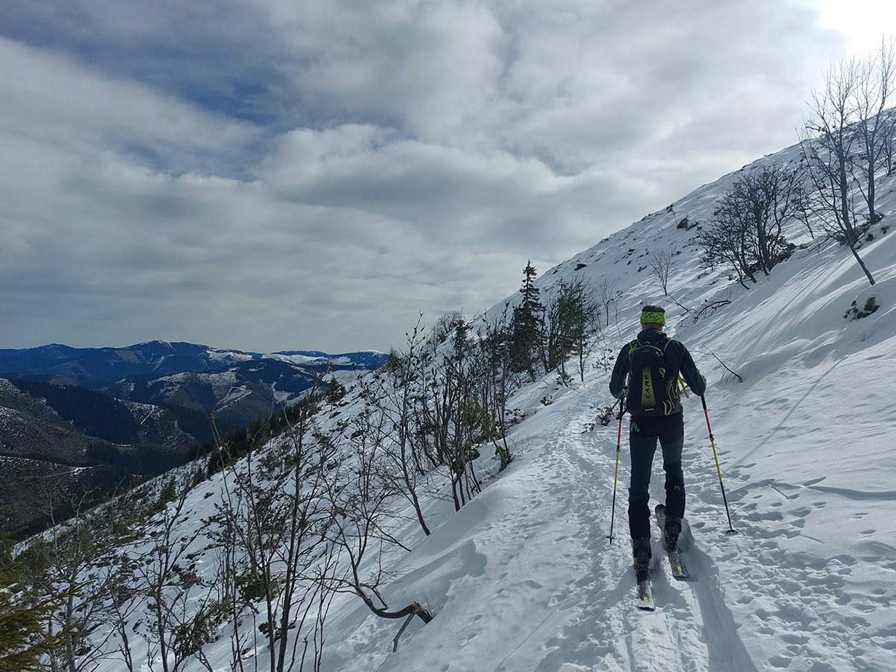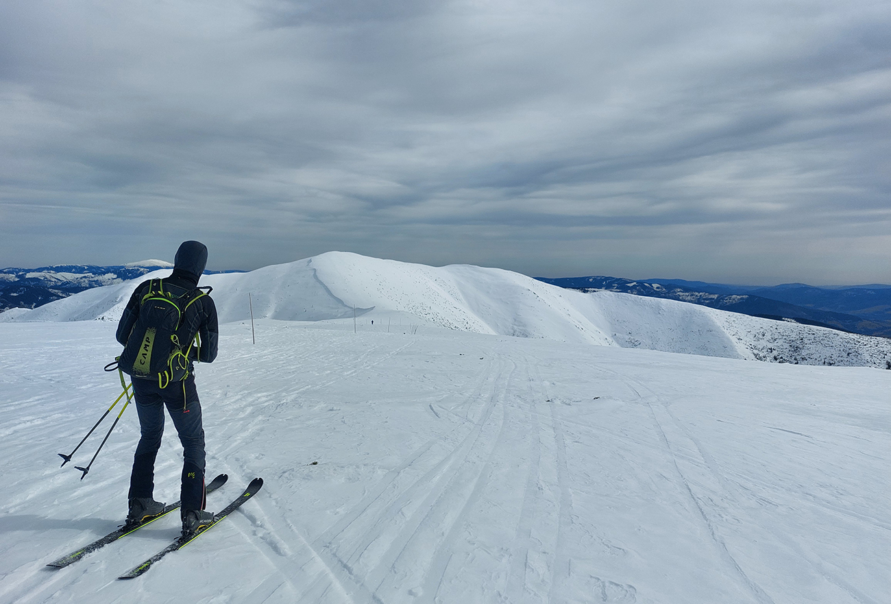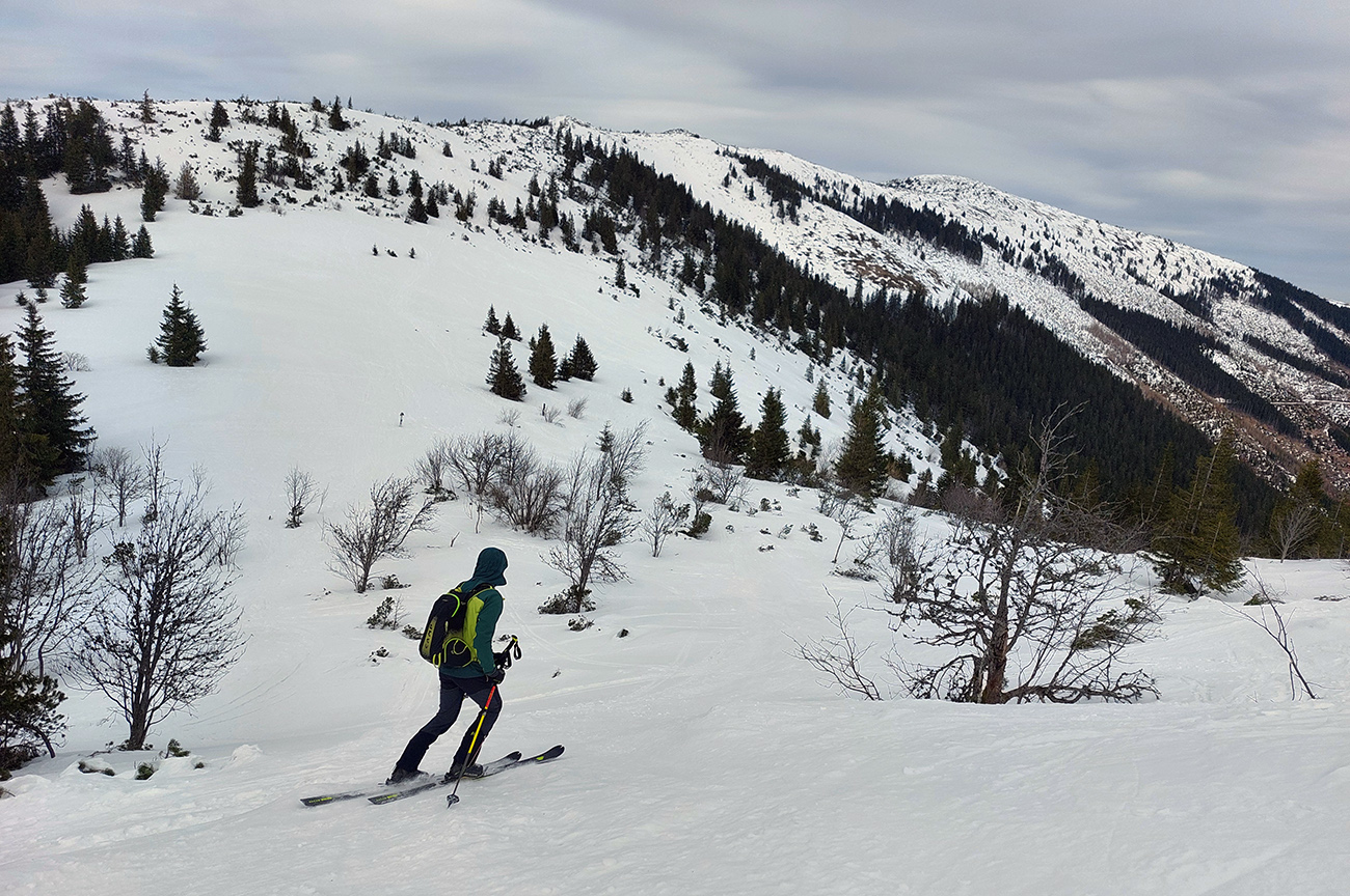 Na hrebeni voľba jasná – stúpame ďalej, na Besnú (1807 m). Lebo vraj je chuť lyžovať a zhora sa uvidí, čo by sa dalo. Lebo je pod mrakom a teda pod nulou, sobotné čisté nebo sa nekoná, pod lyžami to dosť hrkoce. Stúpame miestami už len po zvyškoch, okolo Panskej hole to už dlho v tom južnom traverze nevydrží.