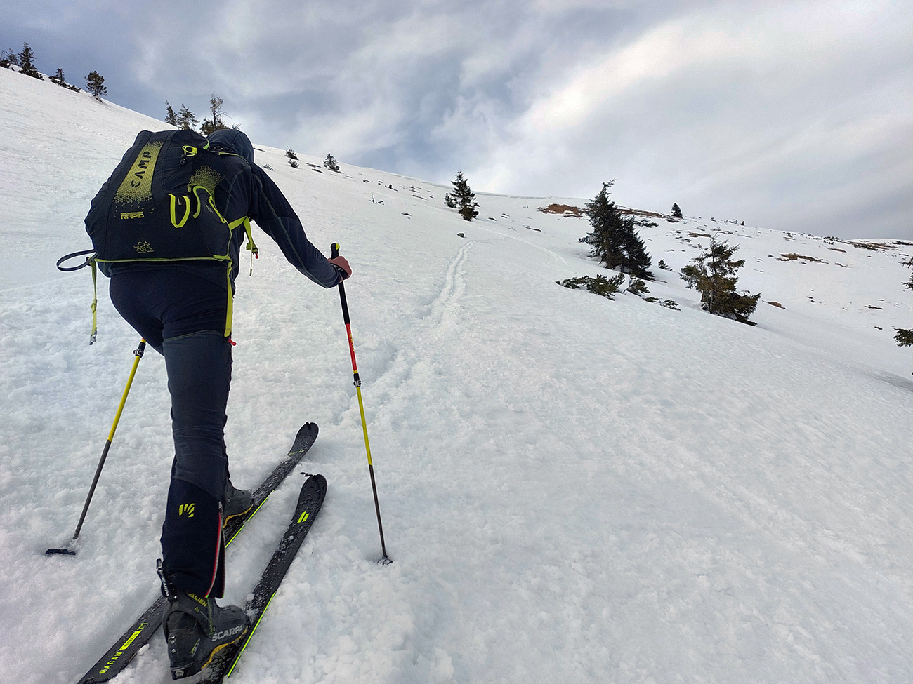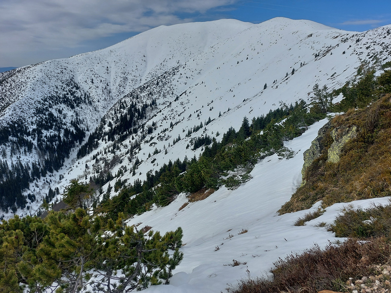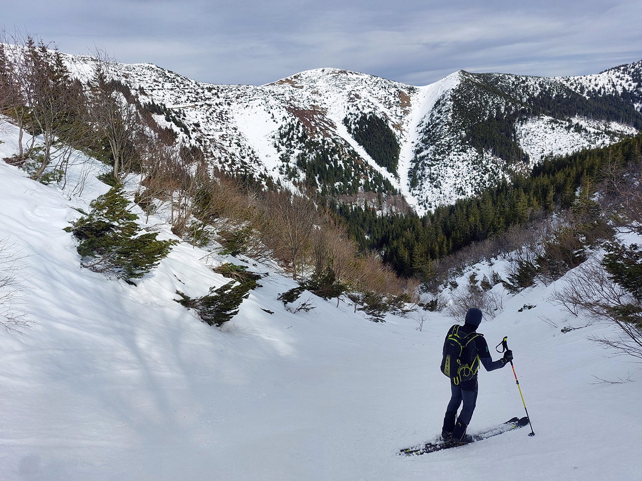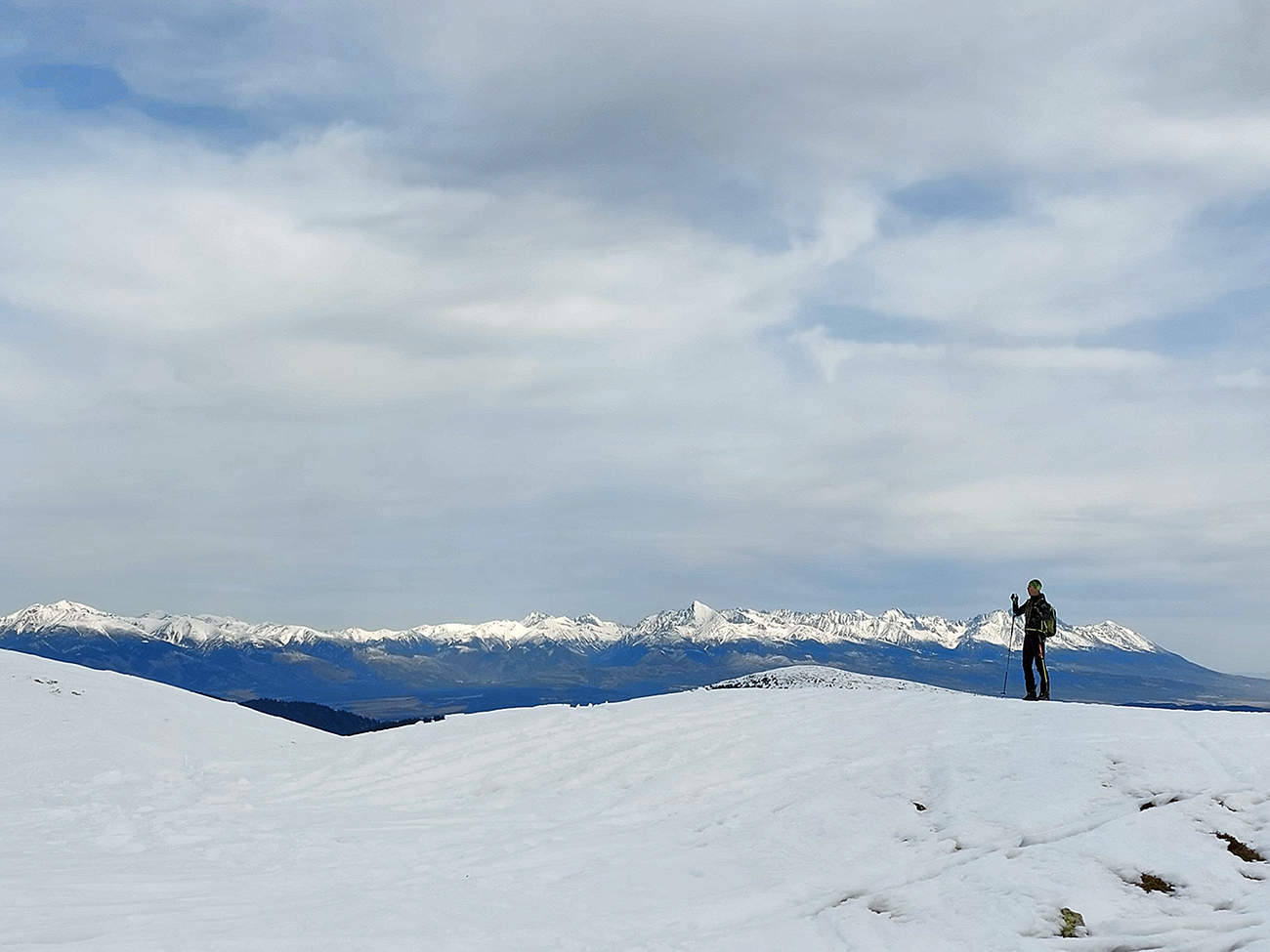 Na hrebeni voľba jasná – stúpame ďalej, na Besnú (1807 m). Lebo vraj je chuť lyžovať a zhora sa uvidí, čo by sa dalo. Lebo je pod mrakom a teda pod nulou, sobotné čisté nebo sa nekoná, pod lyžami to dosť hrkoce. Stúpame miestami už len po zvyškoch, okolo Panskej hole to už dlho v tom južnom traverze nevydrží.