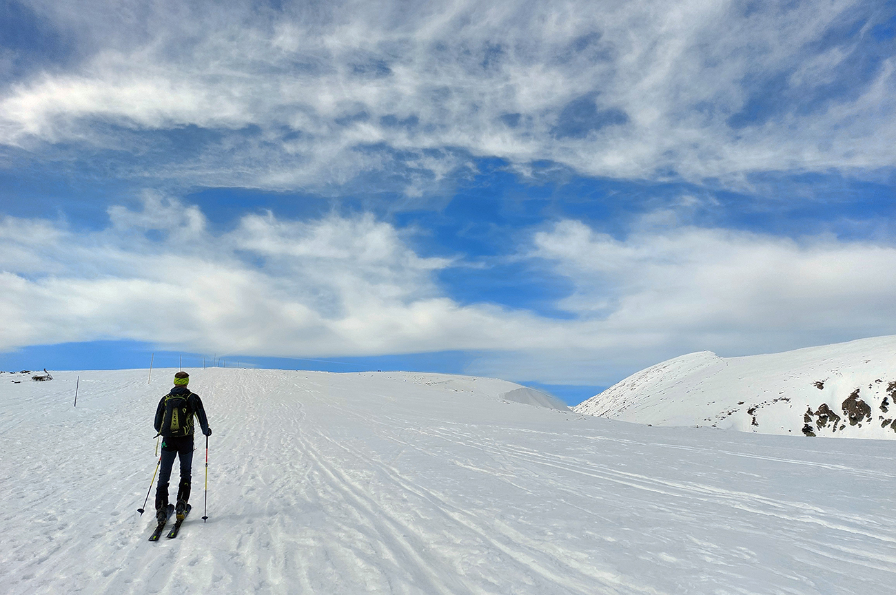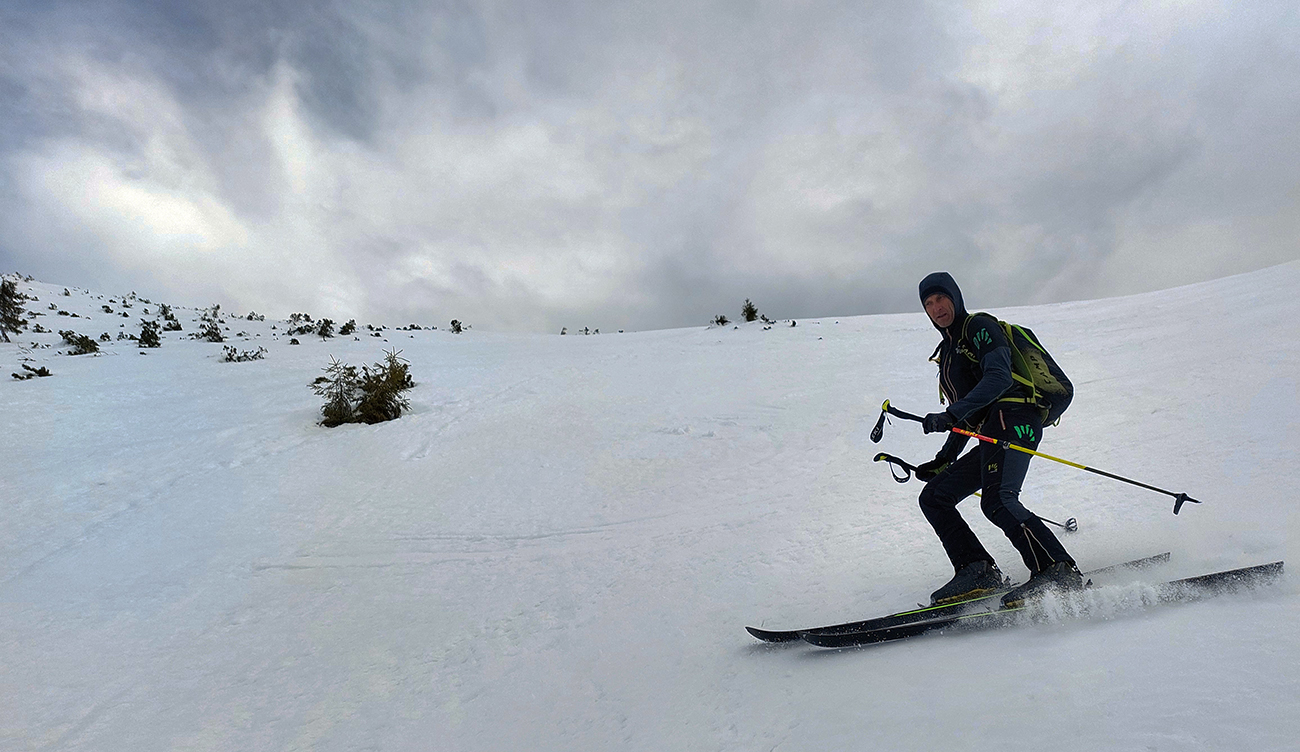 Zároveň sa ale otvárajú výhľady a počasie hovorí, že „východný centrál“ Besnej si asi necháme na koniec, tam teraz ešte zima bude, a teda hrkotavo. Ako prvý skúsime hrebienok z vrcholu na juhovýchod. A opláca sa! Hore trochu prituhnutý, nižšie už odmäknutý firn, ale rovný, také oblúky sa dajú rezať, že až!