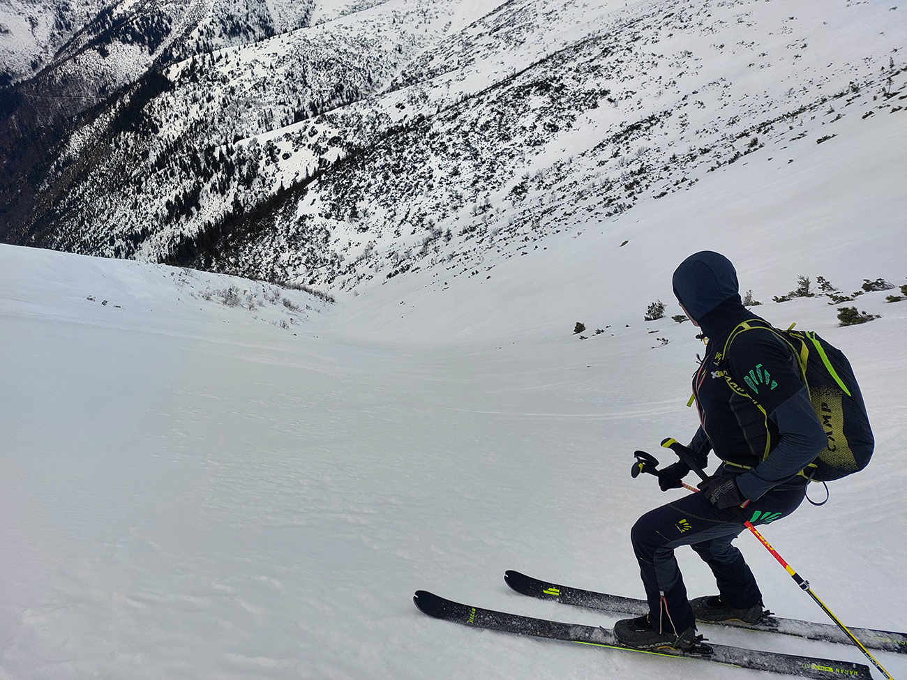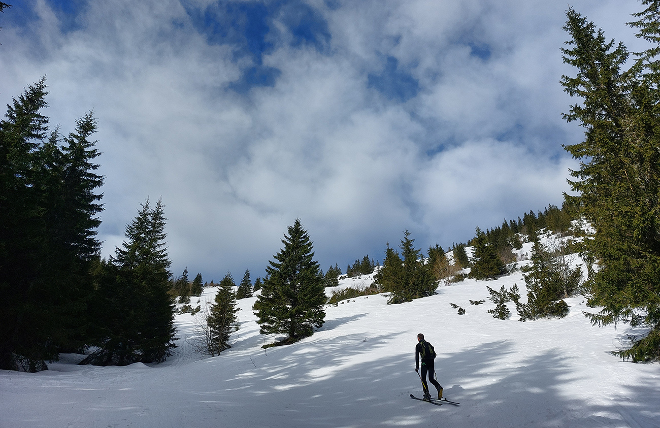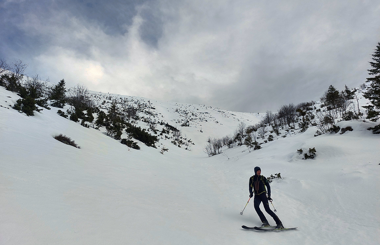 Lebo namiesto návratu traverzom to púšťame do Bocianskeho sedla rovno dole z hrebeňa. Po suchom a tvrdom, krátkymi oblúkmi pomedzi ledva zasnežené vrcholce kosovky. Voľnejšia oblúkovačka z Bocianskeho sedla dole lúkami k lesíku je potom zas o niečom úplne inom, to je pravá jarná firnovačka. Na parádu.