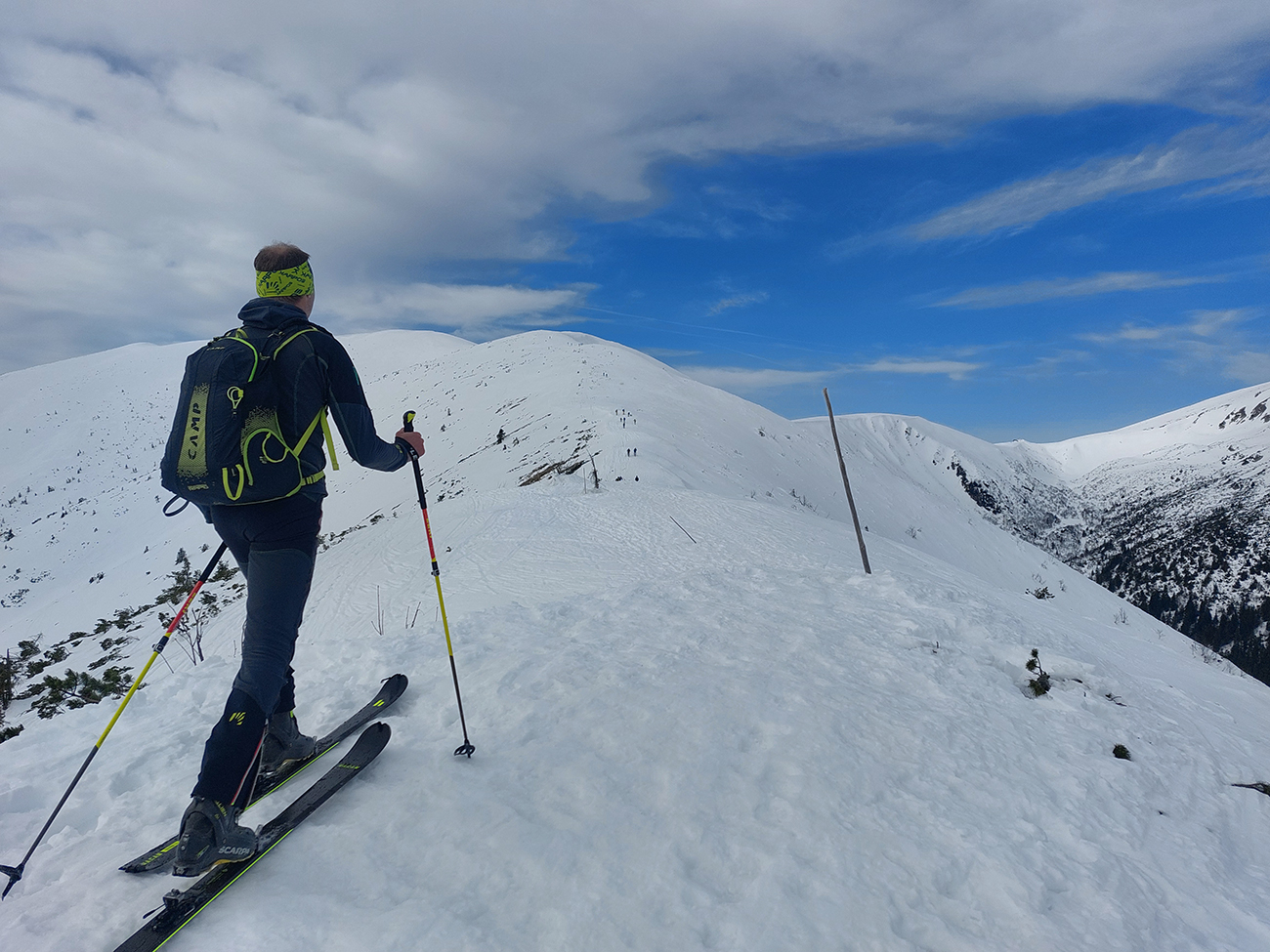Dve nohy už chytajú akúsi krízu, ale aj čas pokročil, tak zhora šmýkame po hrebeni nazad na Besnú, že teda ešte ten „východný centrál“ dáme a z neho po zelenej značke vylezieme do Kumštového sedla. Zámer čiastočne plníme. Lyžovačka výborná, aj pod Besnou to už zmäklo, len zelenú značku chytáme iba chvíľu na spodku, potom sa smerom hore stráca a stopy vedú inde. Tak traverzujeme priamo na Panskú hoľu a dobre robíme.
