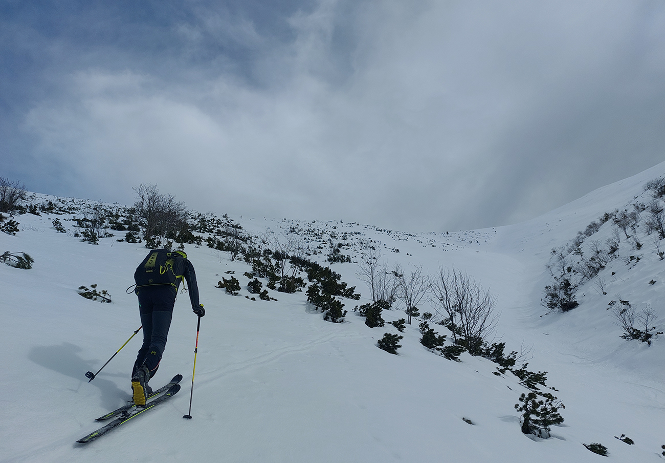 Nazad hore a hneď spomedzi vrcholov sa spúšťame na druhú stranu, na západ. Tentokrát muldou priamo do Pošovej Mlynnej. Tvrdá je, ale nie ľadová, len čím nižšie, tým na kratšie oblúky. Zastavuje nás zúženie a poprepadané diery do potoka. Meter snehu naviac a dalo by sa zísť podstatne nižšie. Pri naliepaní obzeráme hlboké a zablatené stopy „domáceho pána“ pri potoku, potom strmo stúpame vedľajšou muldou, priamo na Králičku.